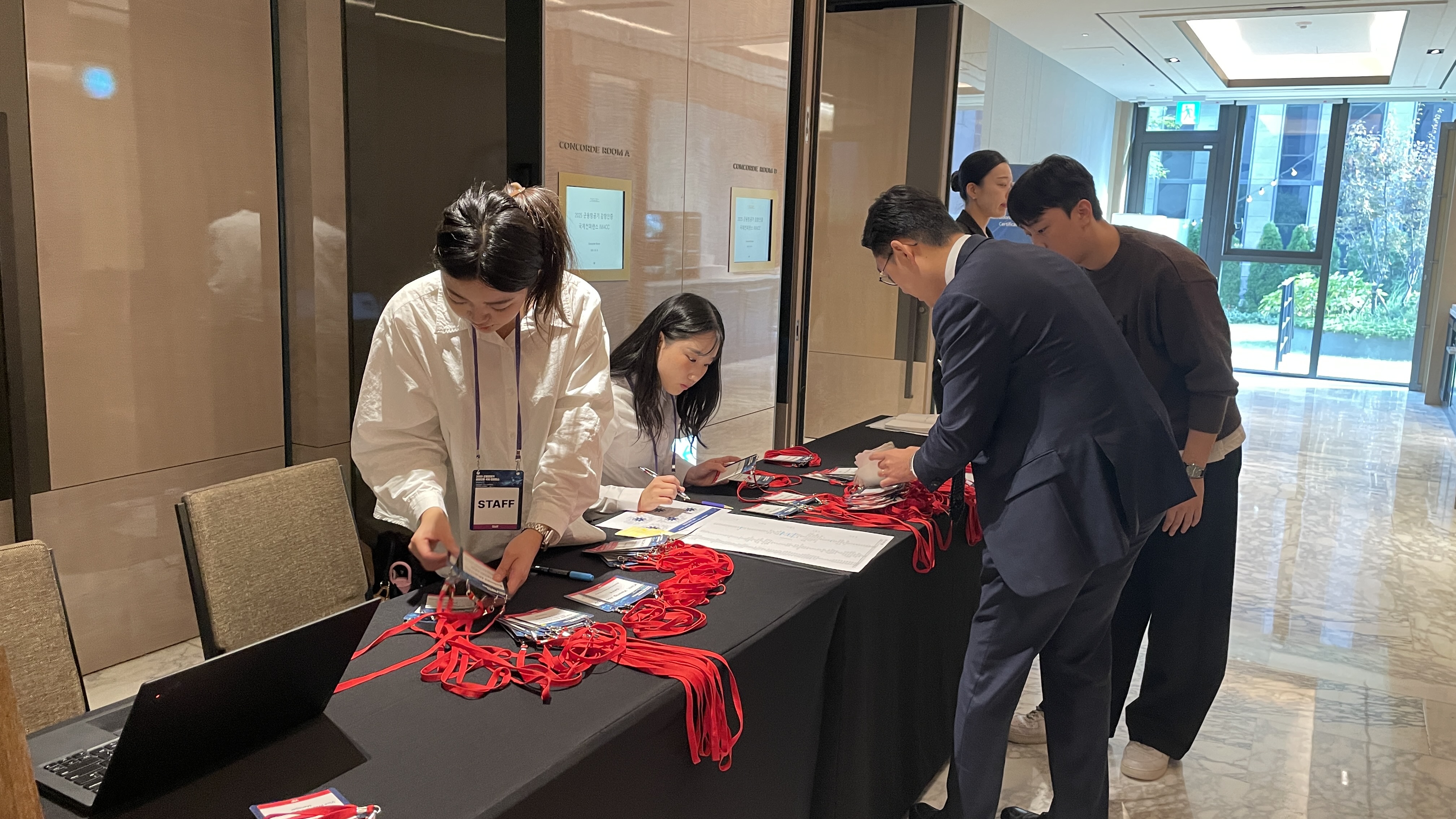 행사 전일 세팅 시에는 방위사업청 측의 요청으로 VIP 및 주요 참가자 명단 변경에 따른 자리 조정과 명패 작업 등을 신속히 수행하였고, 행사 당일에는 빠르게 유입된 등록 인원을 효율적으로 안내하며 초기 혼선도 원활히 정리했습니다.